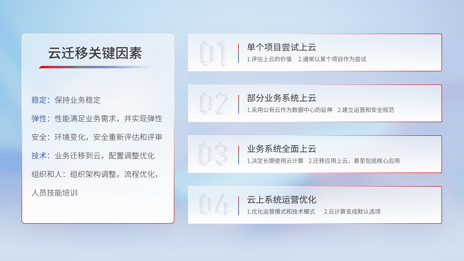 结合实际业务,,从规划设计、、云平台选型、、云原生改造、、、数据迁移、、、、集成交付,,迁移全过程为客户识别最佳上云路径,,,做好风险识别管理,,,设计网络架构、、身份权限、、、、安全审计合规、、、操作审计、、日志审计、、、监控告警策略、、、多站点容灾设计等,,,对云上基础设施进行整体规划,,,提升IT治理水平,,,,以满足弹性、、高可用、、、高性能的需求。。